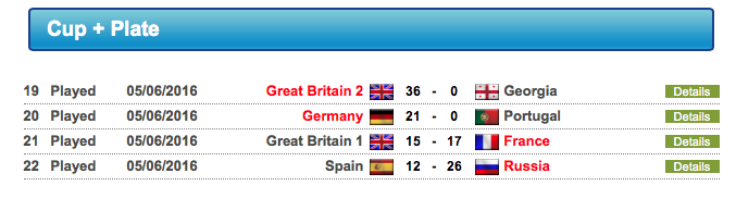 La primera batalla del Europeo la ha ganado Rusia después de imponerse en la final a una renovada Francia por 24-7 y el podium lo ha completado Gran Bretaña que le ha arrebatado la tercera posición a Alemania. La otra selección de Gran Bretaña ha ganado la Copa de Plata de 3 a Georgia; mientras que Italia se ha hecho con la copa de Bronce imponiéndose a Bélgica; y, por último, Polonia ha evitado la última posición al ganar a la sorpresa de las Series Europeas del año pasado, Lituania.