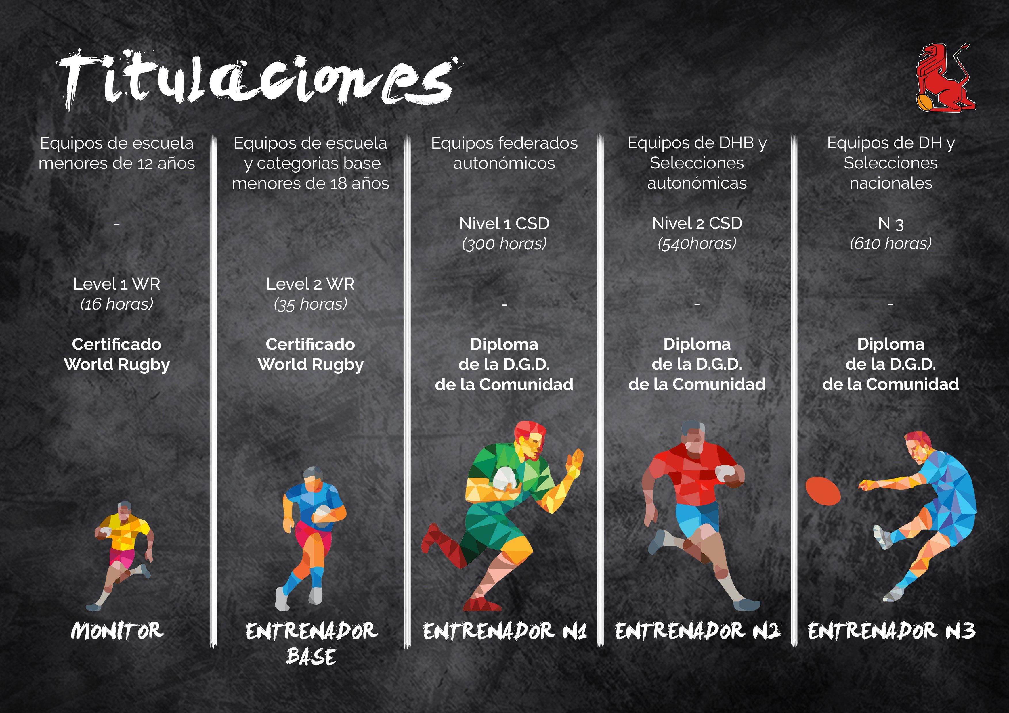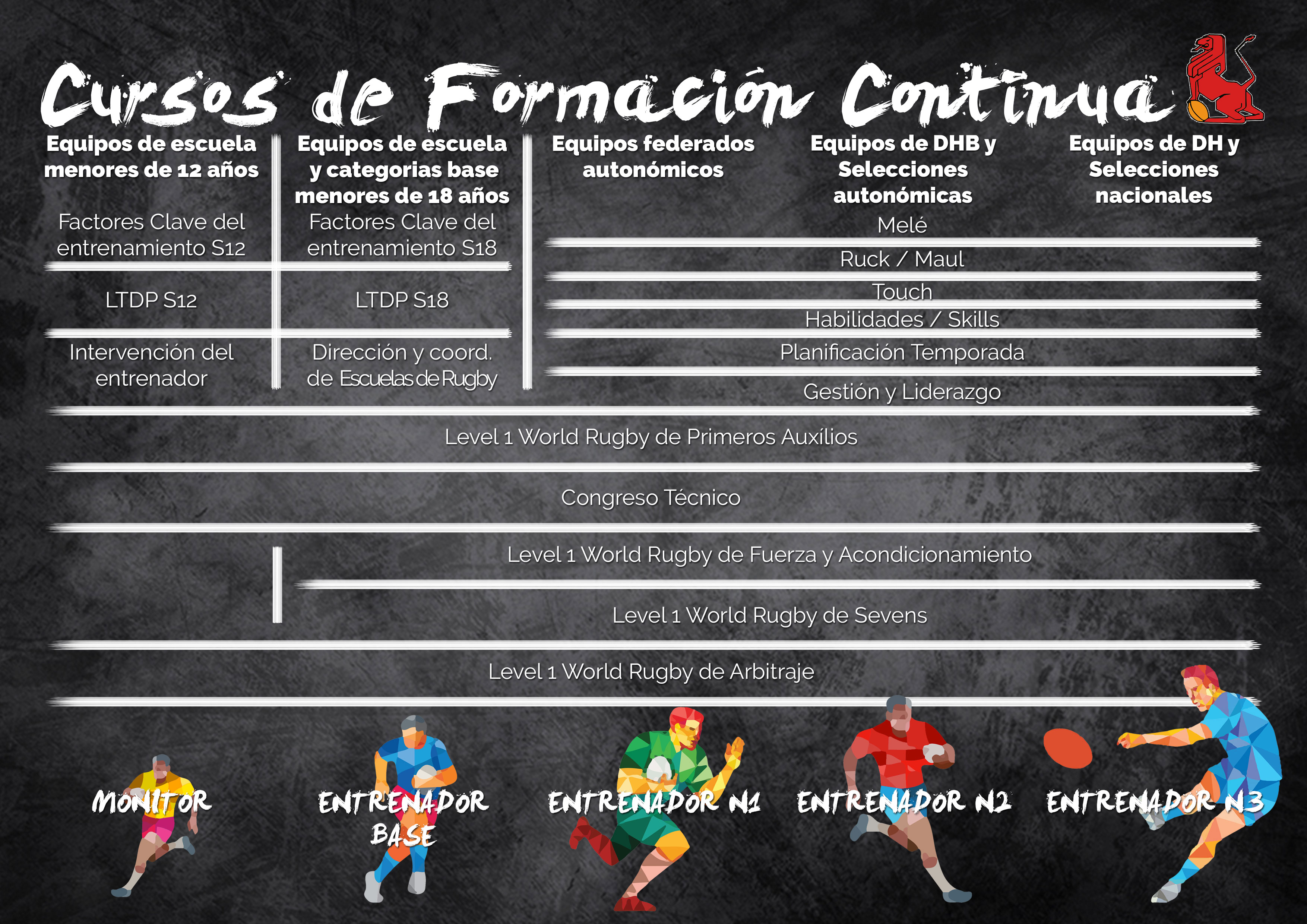 La Federación Española siguiendo las directrices que nos marca el Consejo Superior de Deportes y World Rugby ha definido un camino para cada Nivel de Entrenamiento que se puede completar con una propuesta de Cursos de Formación Continua que permitirá al entrenador acreditar su formación desarrollando por si mismo su nivel de juego como entrenador, convirtiéndose en experto de su Nivel de Entrenamiento.
