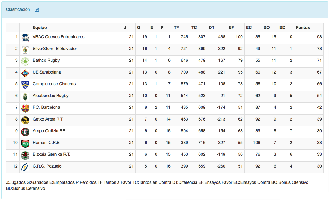El domingo, todos los partidos serán a las 12:30, el FC Barcelona se enfrentará al VRAC Quesos Entrepinares habíendo hecho una gran segunda vuelta y acabando la temporada frente al líder en casa. En San Román Bathco Rugby jugará frente a Bizkaia Gernika con la idea de confirmar su tercera posición, mientras que los basurdes pelearán por salir del descenso sabiendo que ha hecho Hernani. El campeón de Copa SilverStorm El Salvador jugará un difícil encuentro frente a la UE Santboiana en un partido que se puede reeditar en semifinales. Y por último CRC Pozuelo jugará frente a Ampo Ordizia con el objetivo de sumar su sexta victoria, todas ellas en la segunda vuelta, y dejar los deberes hecho a la espera del resultado de Santander.