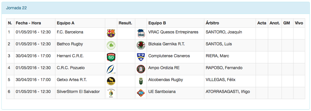 Llegó la última de las 22 batallas de la fase regular de la División de Honor 2015/2016 donde la mitad de los equipos aún no saben qué pasará a falta de 1 jornada para que acabe ésta guerra y empiece otra distinta. En la parte alta de la clasificación, primero y segundo llevan semanas clasificados para semifinales, pero detrás de ellos Bathco Rugby, UE Santboiana y Complutense Cisneros lucharán por ser locales en los cuartos de final, mientras que Alcobendas ya sabe que lo hará como visitante.