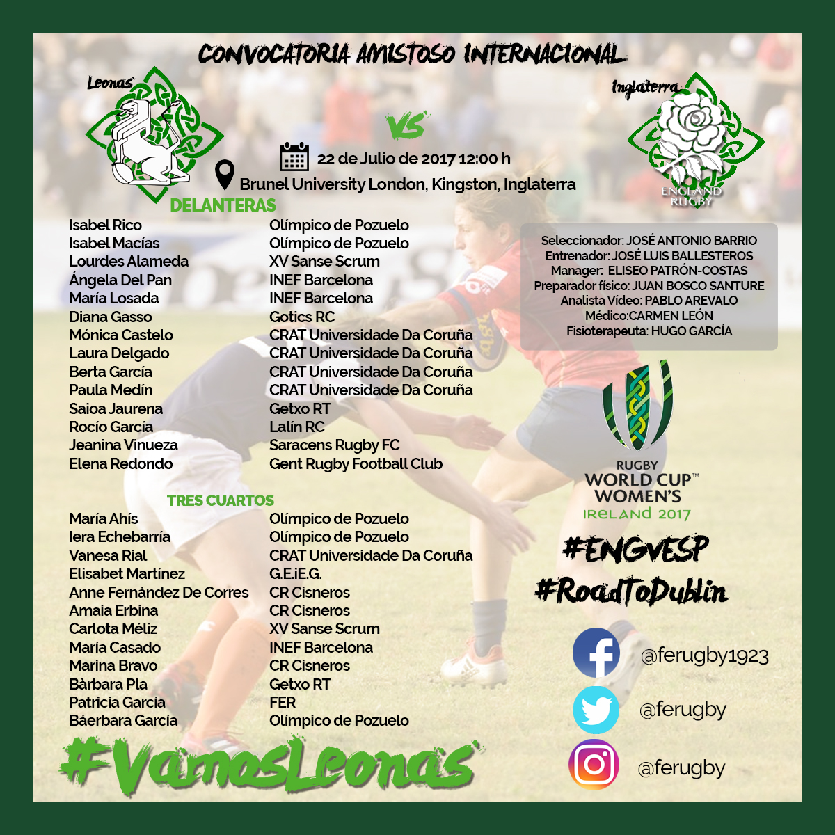 Las jugadoras de la Selección Española de Rugby XV femenino afrontan este sábado 22 a las 12:00 horas su último partido preparatorio antes de volar rumbo a Dublin para encontrarse con los mejores equipos del mundo. El rival de las Leonas es nada más ni nada menos que el combinado B de las actuales campeónas del Mundo, Inglaterra. Las del XV de la rosa llegan en muy buen estado de forma y con un chute de energía extra tras haber ganado a las todopoderosas Black Ferns, por lo que el encuentro va a ser muy complicado para las Leonas, y va a dar pistas al seleccionador José Antonio Barrio de quiénes van a ser las definitivas en la lista mundialista.