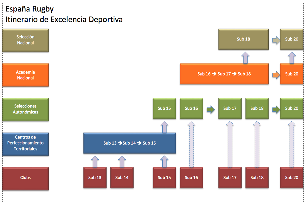 La Federación Española de Rugby ha creado el Itinerario de Excelencia Deportiva estructurado en cinco niveles con la finalidad de promover la detección de jugadores con talento y su posterior desarrollo hasta convertirse en jugadores internacionales.