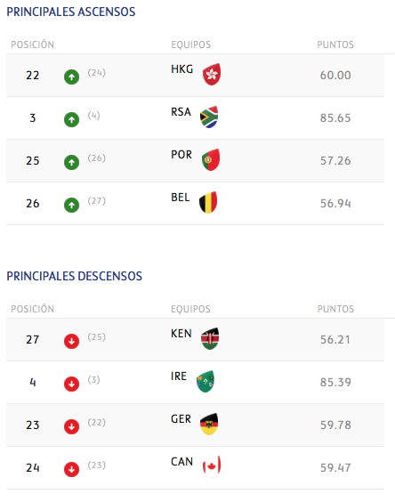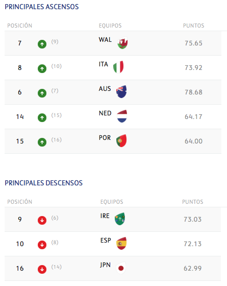 Gales e Italia son las dos selecciones que más progresan en el ranking, subiendo dos posiciones, mientras que Irlanda, que pierde tres, y España y Japón, con dos, son los equipos que más descienden en la clasificación.