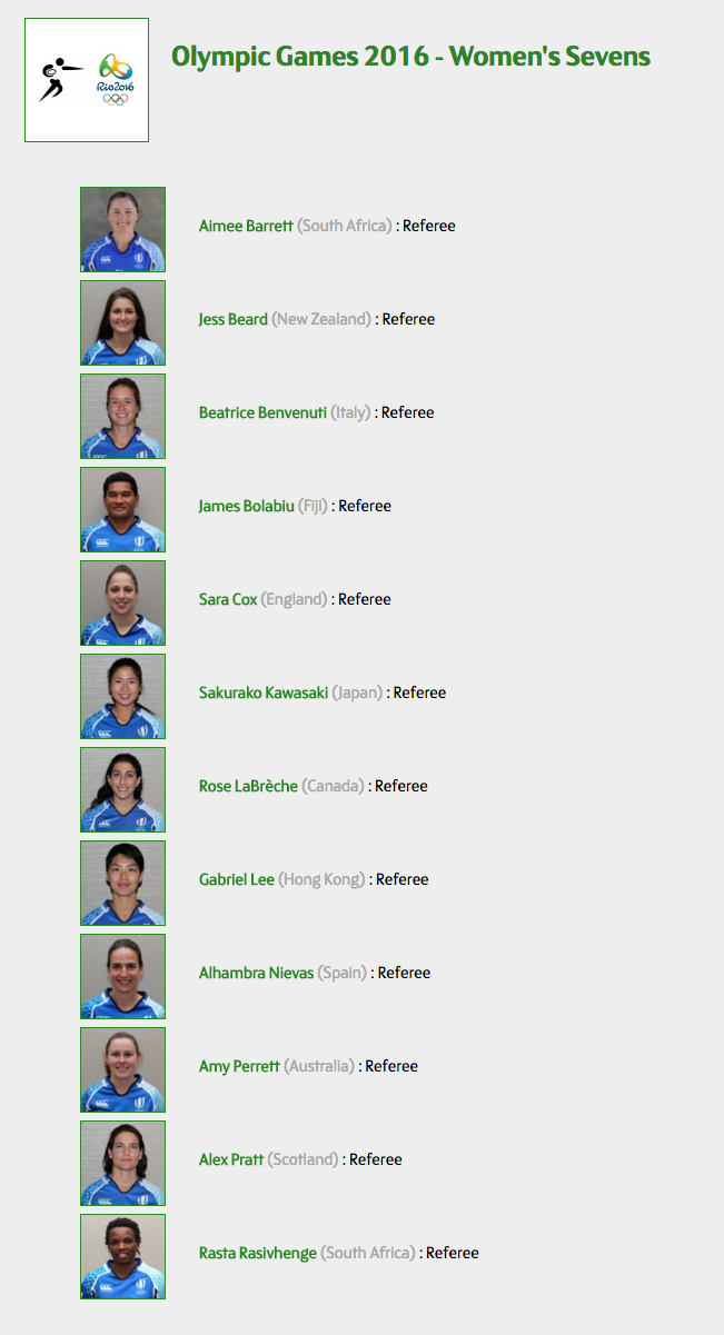 World Rugby ha dado a conocer las designaciones de los árbitros que participarán en los Juego Olímpicos de Rio de Janeiro 2016 y entre los 12 colegiados estará la española Alhambra Nievas, nuestra colegiada más internacional. Con éste nuevo anuncio la granadina suma otro éxito más a su colección y pondrá el broche a una temporada increible que comenzó con su nominación a Mejor árbitro del año.