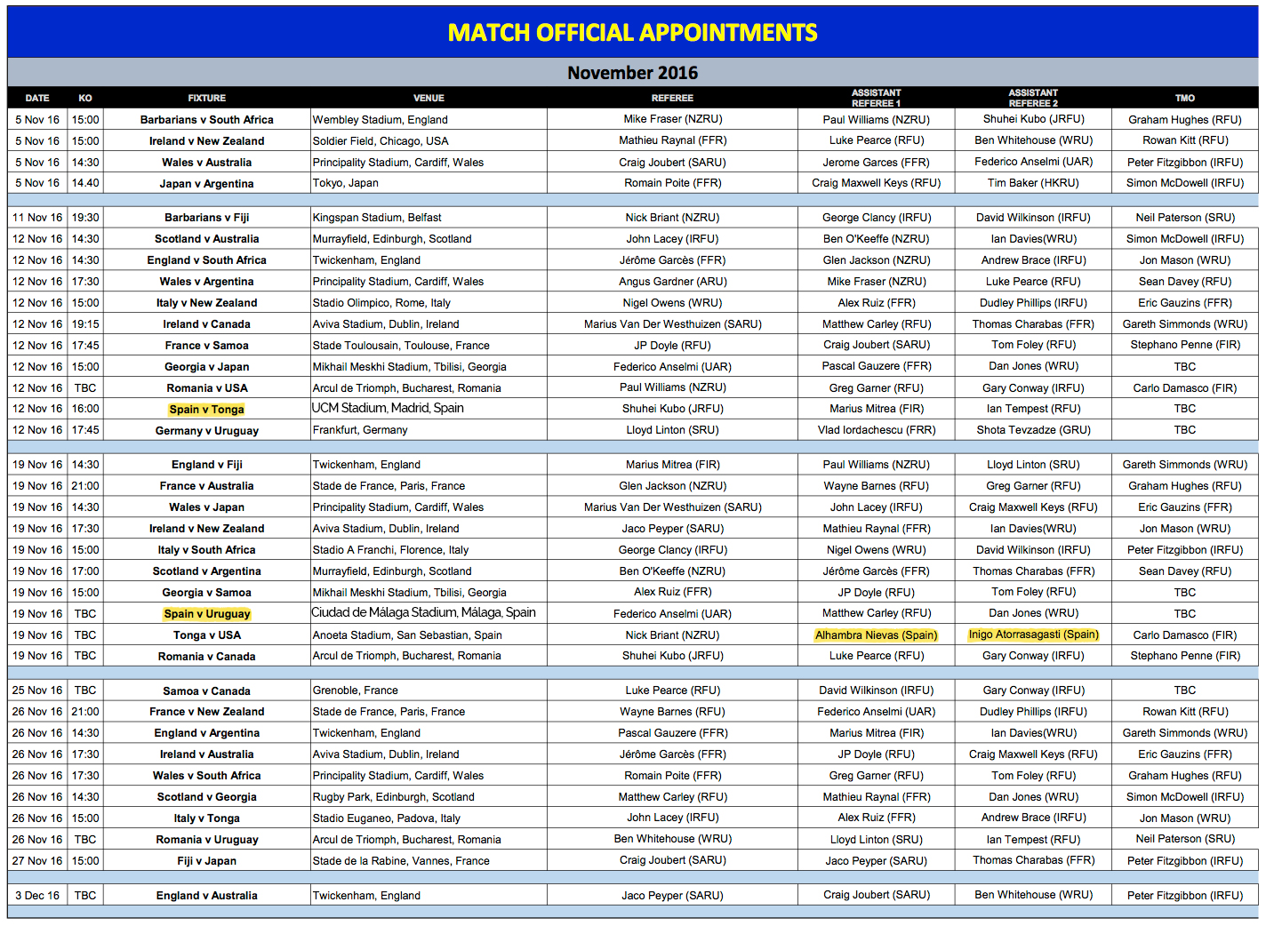 El Presidente del Comité de Selección de Árbitros de World Rugby, Anthony Buchanan, en relación a éste tipo de nombramientos dijo: "Ha pasado un año desde la Copa del Mundo de 2015 y estamos trabajando para desarrollar talento fresco para RWC 2019 en Japón. Noviembre nos da muchas oportunidades con múltiples partidos complejos para los árbitros, sus asistentes y los TMO. Esto nos da la posibilidad de analizarlos bajo la presión e intensidad del rugby internacional." Además afirmó, "El objetivo final es llegar a Japón 2019 con un grupo establecido de árbitros en su mejor momento con la necesaria experiencia para dirigir en el nivel mas alto. Nuestro foco continúa siendo tomas de decisión claras y consistentes y el mejor estado atlético." .