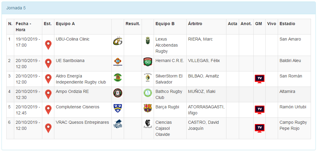 Como colofón a la quinta fecha, a las 12:45 el CR Complutense Cisneros quiere volver a la línea mostrada en sus dos primeros choques y enmendar la mala imagen de la J4, si bien se ven las caras ante un Barça Rugbi que apunta alto este año, como demostró al vencer a El Salvador. A diferencia de lo habitual, el partido se celebrará en el Ramón Urtubi, recinto del CR Liceo Francés, y no en el Estadio Nacional Complutense. Sin embargo, con dos estilos muy distintos pero que están siendo bastante rentables en este inicio liguero, ambos conjuntos prometen hacer que esta circunstancia pase desapercibida con un gran partido, que además contabiliza para Copa.