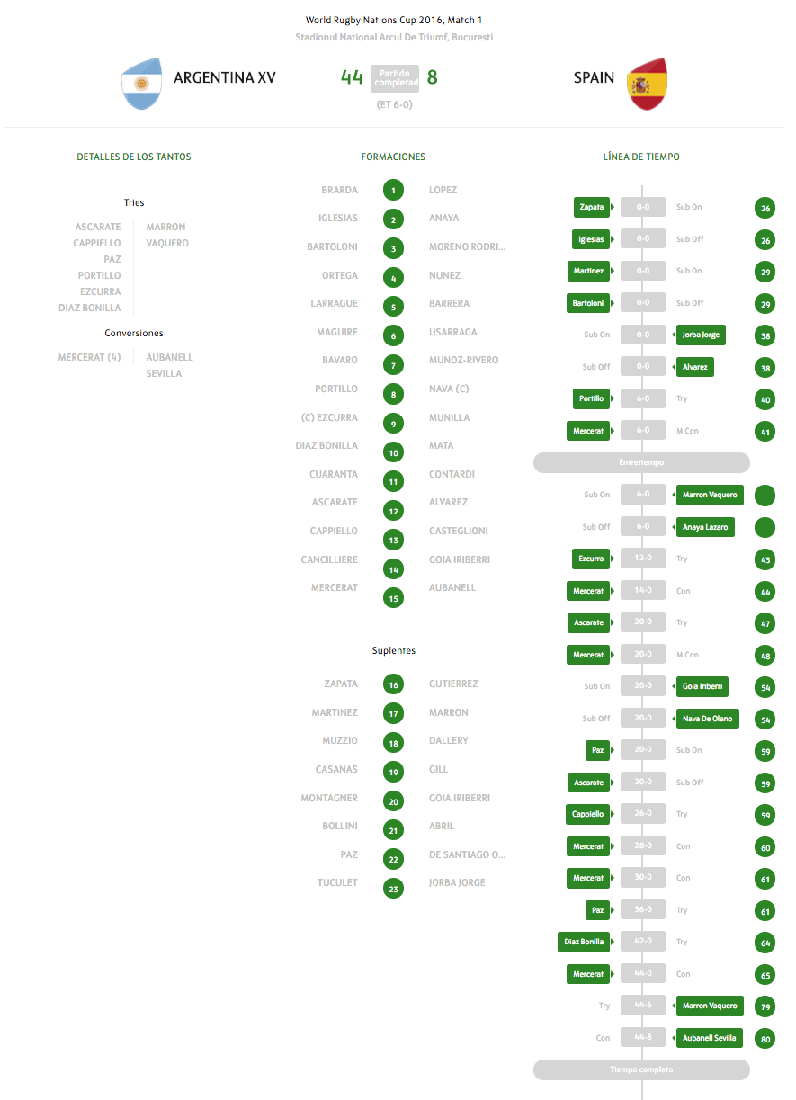 La segunda parte fue de principio a fin para Argentina que solamente tardarían tres minutos en volver a anotar y antes del minuto 65 habrían logrado otros cuatro ensayos ensayos más. A partir de ese momento los Jaguares se relajaron y España pudo volver a meterse en el encuentro, fruto de ello, en la penúltima jugada del partido Dani Marrón logró el ensayo del honor de la Selección después de una buena jugada de la delantera española.