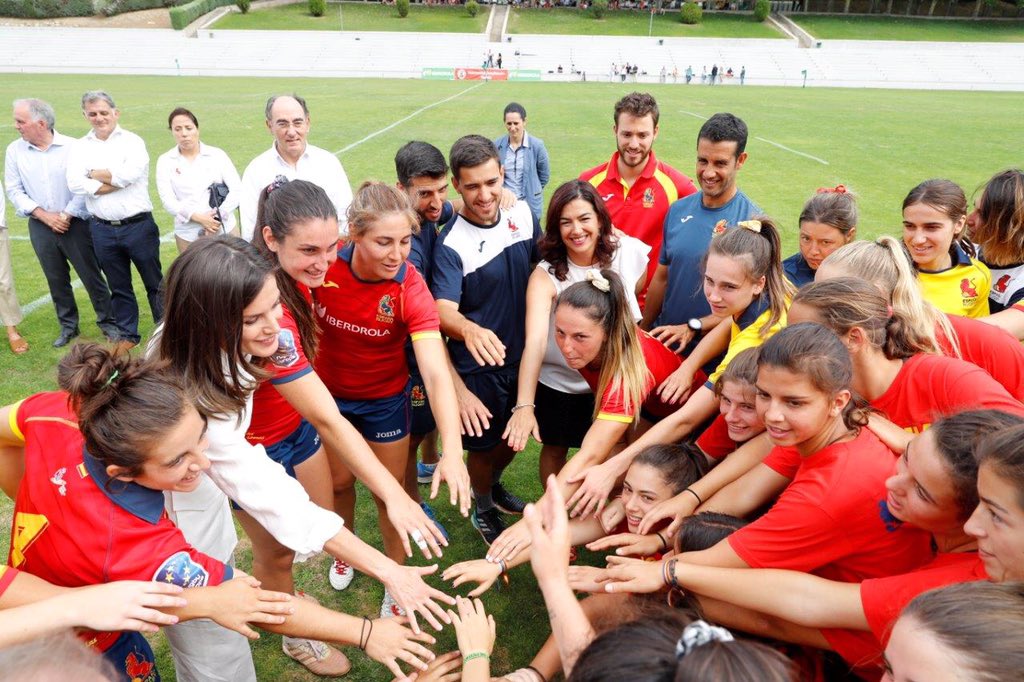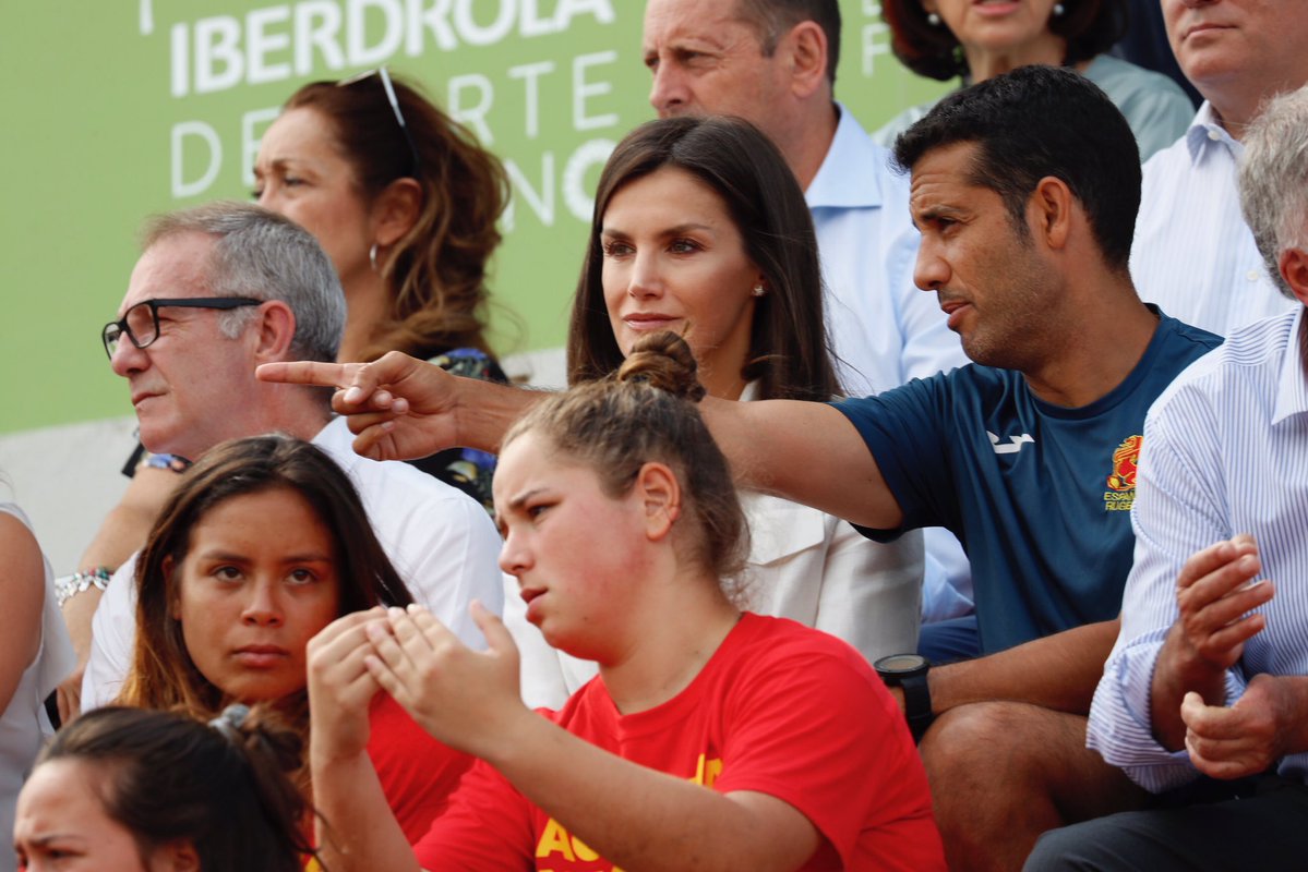 Una vez en la grada del emblemático estadio de rugby conocido como El Central, la Reina presenció la sesión preparatoria junto al seleccionador, Pedro de Matías, quien le explicó aspectos de la modalidad olímpica del rugby y dispuso a sus jugadoras para un partido de exhibición, que fue dirigido por la árbitra internacional, Cintia Loyola.