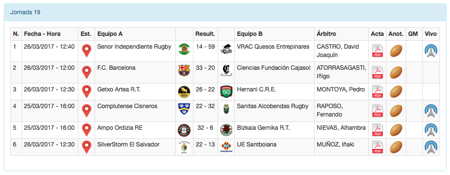 En los enfrentamientos adelantados al sábado de la decimonovena jornada se impusieron los equipos que partían en una posición más alta en la tabla, Sanitas Alcobendas Rugby y Ampo Ordizia. El derbi madrileño cayó del lado visitante que volvió a la senda del triunfo a costa del Complutense Cisneros; mientras que el derbi vasco lo ganó el equipo local que alza hasta la sexta posición, entrando en los cuartos del play off, por la derrota del Senor Independiente.