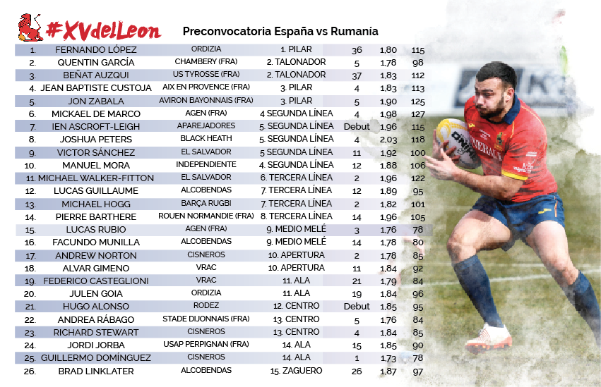 En esta nueva lista vemos una renovación casi total de la primera línea, en la que sólo repiten el capitán Fernando López y Jon Zabala, y a la que se incorporan Jean Baptiste Custoja, Beñat Auzqui y Quentin García, a falta de saber otro pilier izquierdo que entrará a formar parte de la concentración lo antes posible. También destacan la vuelta de Pierre Barthere, un seguro en la tercera línea, Brad Linklater, que puede aportar puntos al pie y desequilibrio desde la posición de zaguero, Joshua Peters, altura para la touch y un candado en defensa, además de Hugo Alonso, que puede estrenarse con el XV del León.