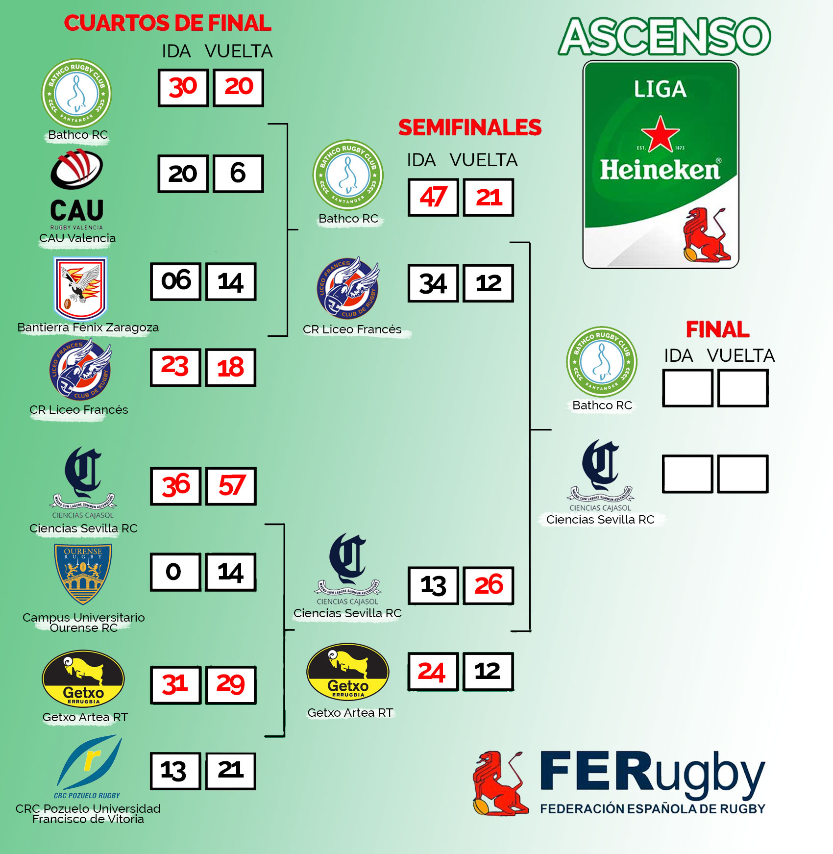 No cabe duda de que nos espera una final con dos estilos de juego diferentes, aunque muy efectivos en ambos casos, como cántabros y andaluces vienen demostrando todo el año, y la emoción está asegurada. La vuelta será el domingo 19 en la Cartuja y el equipo subcampeón de la fase de ascenso se medirá al C.R. La Vila en la promoción, donde se decidirá la última plaza para la Liga Heineken 2019-20.