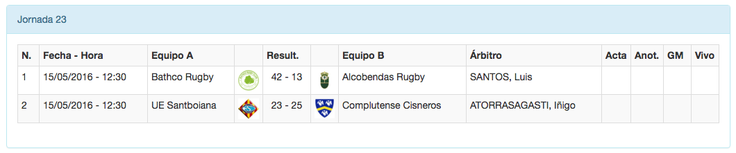 Los cuartos de final de Liga se han saldado con el pase a semifinales claro de Bathco Rugby en San Román ante un voluntarioso pero poco eficaz Alcobendas Rugby y la victoria en la última jugada del partido del Complutense Cisneros que eliminaba a la UE Santboiana gracias a un golpe transformado con el tiempo cumplido. Los dos semifinalistas se medirán en Valladolid la semana que viene ante primero y segundo en la fase regular por lo que los cruces quedan de la siguiente manera: VRAC Quesos Entrepinares (1º) – Complutense Cisneros (5º) y SilverStorm El Salvador (2º) – Bathco Rugby (3º).