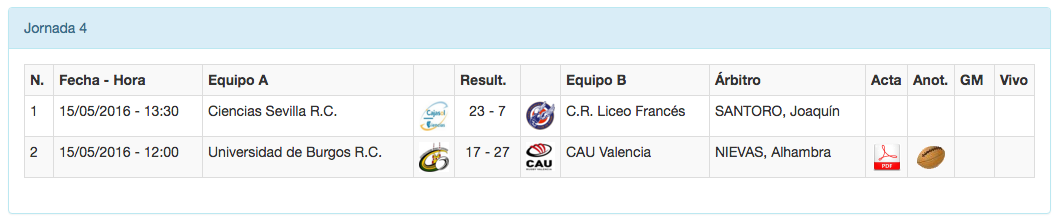 CAU Valencia ganó en Burgos a Aparejadores 27-17 haciendo bueno el empate en el partido de ida en Valencia y, por su parte, Ciencias ganó 23-7 a Liceo Francés ganando de esta manera los dos partidos de las semifinales y llegando invicto a la gran final.