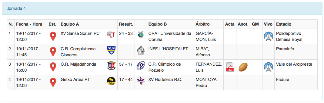 El XV Hortaleza consiguió una victoria muy importante lejos del Juan Pablo II al ganar con bonus al Getxo Artea en el velódromo de Fadura y ascendiendo hasta la cuarta posición aprovechándose del tropiezo del XV Sanse Scrum. Al igual que en partido del Dehesa Boyal las visitantes comenzaron marcando el ritmo desde el primer minuto y sólo en los instantes finales de la primera parte las getxotarras se acercaron en el marcador logrando dos marcas que dejaban abierta la segunda parte al comenzarla con el resultado de 12-24. Pero las Dragonas no estaban dispuestas a dejarse la victoria y en la segunda se repitió el guión, los primeros 30 fueron de Hortaleza y los últimos 10 para las locales. Al final el 17-44 final refleja la superioridad del equipo madrileño y deja a Getxo penúltima a sólo 4 puntos del INEF L Hospitalet.
