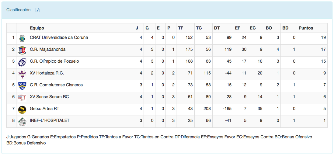 CRAT Universidade da Coruña, único equipo invicto de la competición, se alza hasta lo más alto de la clasificación de la Liga Iberdrola de Rugby después de su victoria sobre el XV Sanse Scrum en la Dehesa Boyal aprovechándose del tropiezo de ayer de Olímpico de Pozuelo ante Majadahonda que se sitúa en segunda posición. En la parte baja de la clasificación las dragonas del XV de Hortaleza ganaron a Getxo Artea en Fadura sumando su segunda victoria y llevando al equipo getxotarra a la penúltima posición sólo por encima de INEF L Hospitalet que no disputó su partido ante el Complutense Cisneros.