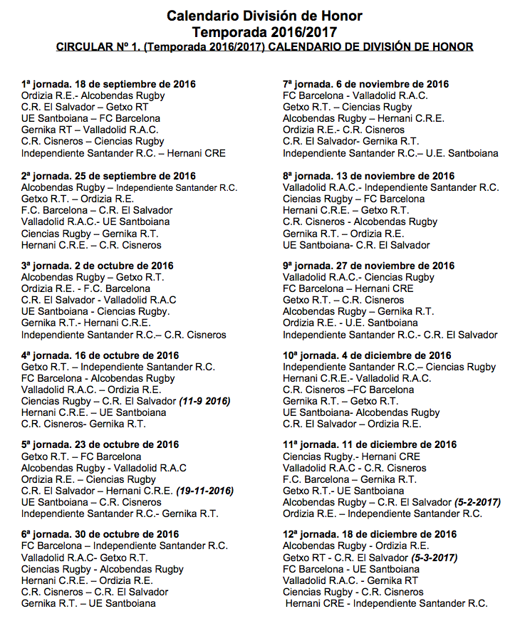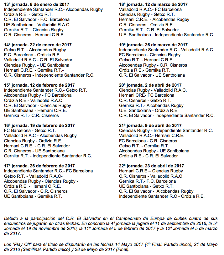 El fin de semana del 17/18 de septiembre comienzan las competiciones nacionales de División de Honor y División de Honor B de la temporada 2016-2017. No obstante, debido a los compromisos europeos del C.R. El Salvador se adelanta al día 11 de septiembre el encuentro de la 4ª jornada que ha de disputar en Sevilla contra el Ciencias Rugby. La última jornada de la fase regular de Liga será el 23 de abril de 2017.