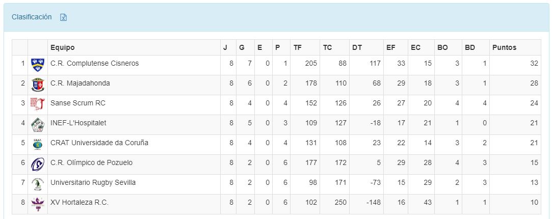 La jornada 8 de la Liga Iberdrola de Rugby nos ha dejado varias sorpresas, y apreta todavía más la tabla en lo que se empieza a definir como una segunda vuelta apasionante, tanto para saber qué cuatro equipos se ganarán la oportunidad de disputar los play-offs, como en la lucha por salir del último puesto y evitar el descenso directo. Cisneros hizo el sábado los deberes ganando con claridad 32-5 al XV de Hortaleza, y Majadajonda no pudo hacer lo propio ante Crat Universidade A Coruña, que ganó en Madrid 8-24, por lo que le da algo de ventaja a las colegiales. En la parte baja, Olímpico no pudo superar a Sanse en el partido adelantado de la semana pasada, y Universitario de Sevilla dio la sorpresa en la Feixa Llarga imponiéndose 20-29 a INEF- L Hospitalet y abandonando así el puesto de descenso directo, y dejando en esa incómoda posición al XV Hortaleza.