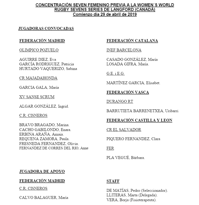 Si hace tan solo unos días la Selección femenina de Seven volvía de la Serie Mundial de Kitakyushu, el próximo lunes, 29 de abril, el equipo de Pedro de Matías vuelve a concentrarse en Madrid, para comenzar la puesta a punto de cara a la siguiente ronda del campeonato, que se disputa en Langford (Canadá), del 11 al 12 de mayo.
