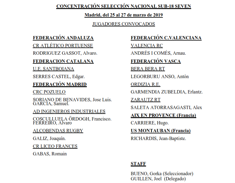 El núcleo principal de la lista de 14 está formado por jugadores con cada vez más peso en la estructura de varios clubes con solera en el rugby español. Completan la convocatoria dos jóvenes prometedores que juegan actualmente en Francia como son Hugo Carriere y Jean-Baptiste Richardis.