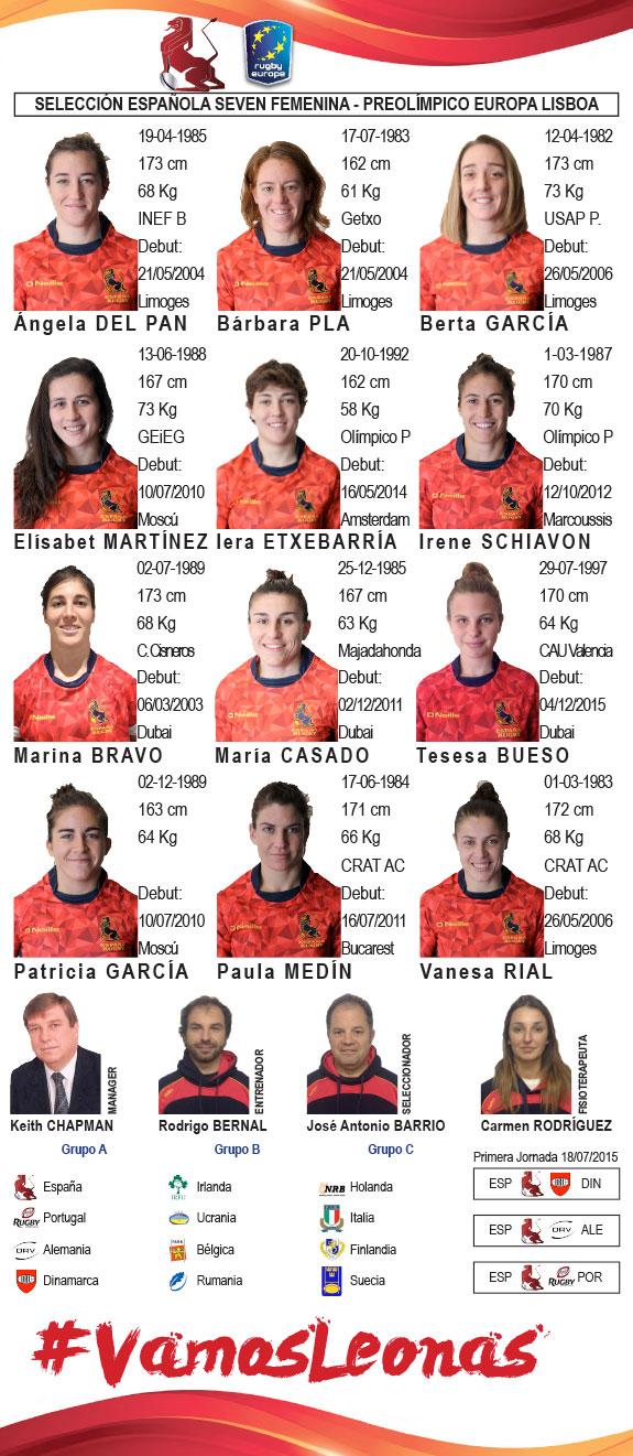 El seleccionador nacional de seven femenino, Jose Antonio Barrio, ha dado a conocer la lista definitiva de las doce jugadoras que disputarán el proximo fin de semana la repesca olímpica europea en Lisboa. Tras finalizar terceras en las WGPS 7s europeas, las Leonas parten como favoritas y de esa manera han quedado encuadradas en el grupo A junto con Dinamarca, Alemania, y las anfitrionas, Portugal.