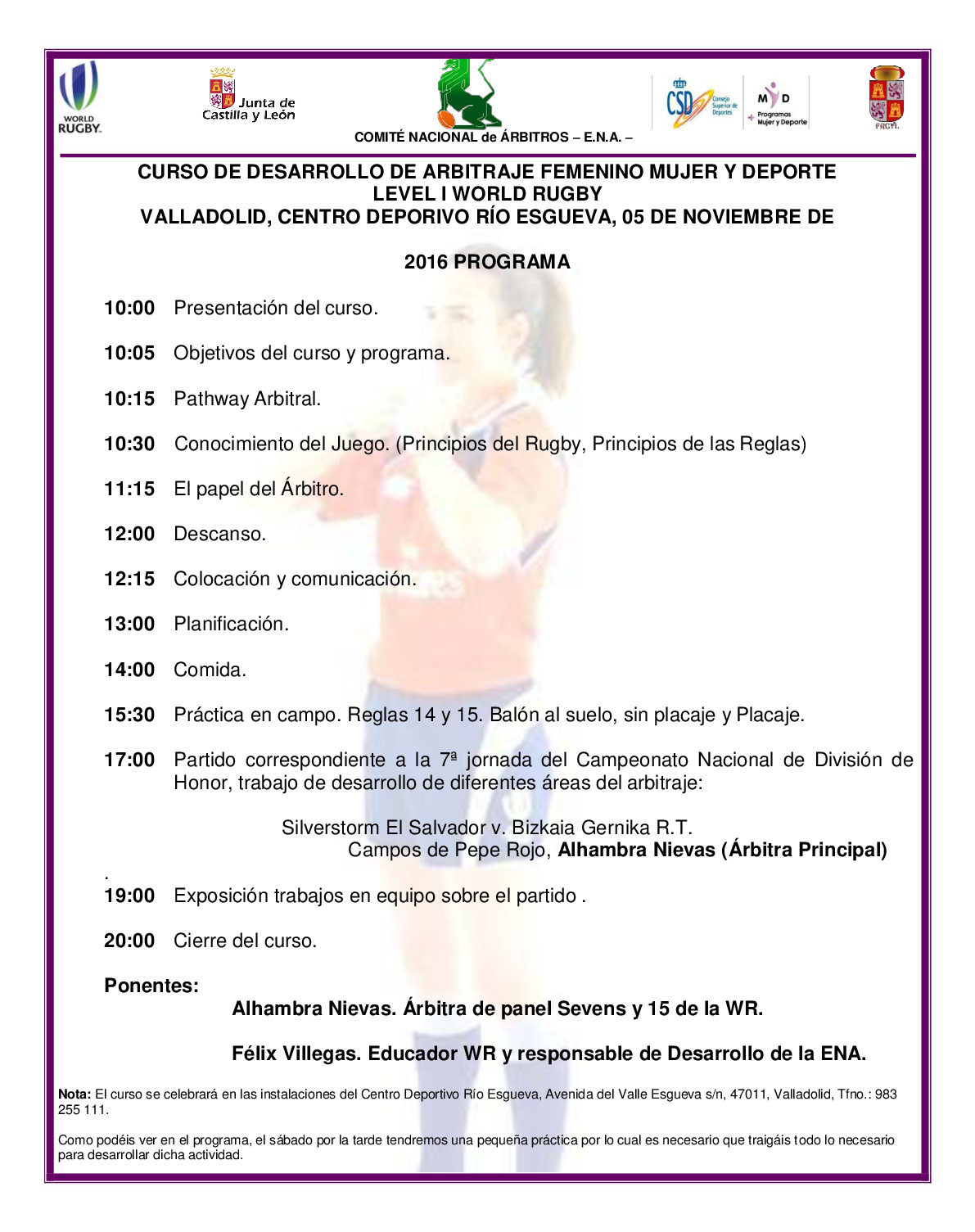 Los ponentes del curso serán Félix Villegas, Educator World Rugby, y Alhambra Nievas, árbitro DH y WR.