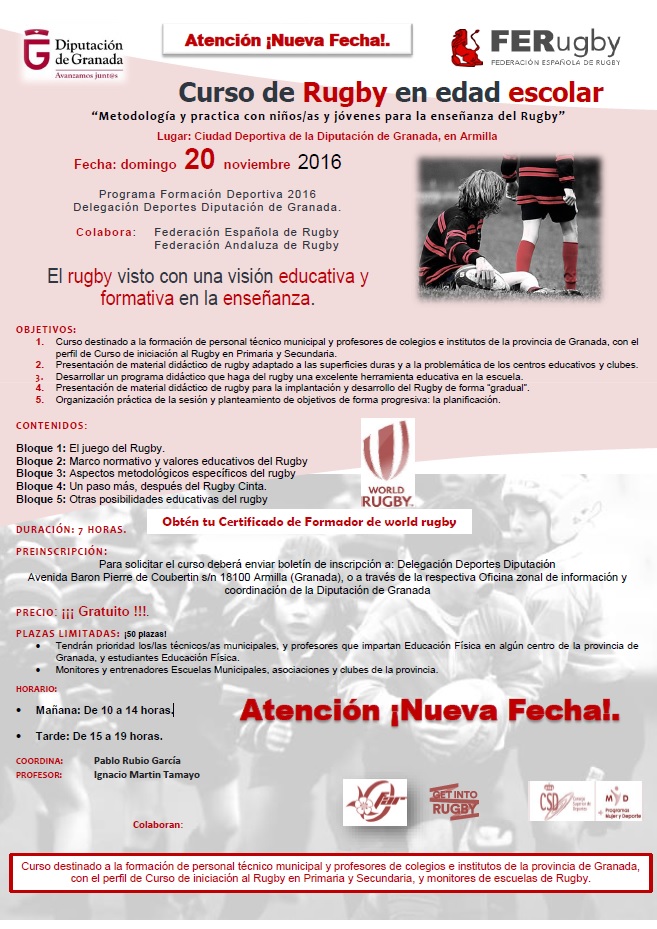 El pasado domingo 20 de Noviembre, la Delegación de Deportes de la Diputación de Granada organizó el Curso de Rugby en edad Escolar: “Metodología y práctica con niños/as y jóvenes para la enseñanza del Rugby” , en colaboración con la Federación Española de Rugby y del Programa de “Mujer y Deporte” del Consejo Superior de Deportes.