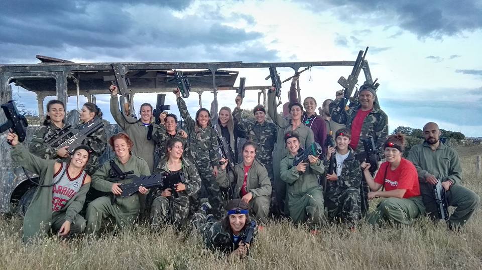 Para ir a la actividad de las pistolas vamos en nuestros coches hasta una parcela en Tres Cantos. Cuando llegamos nos dividimos en dos equipos. Uno verde y otro de camuflaje. Los chicos de la empresa nos guían y enseñan las estrategias, cómo se manejan las armas y nos ayudan o penalizan durante las partidas.