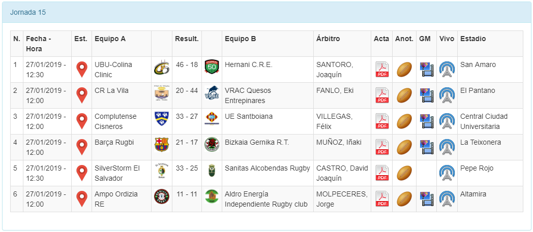 El UBU-Colina Clinic sigue en racha y, tras vencer al Hernani, se pone en zona de playoffs. Por su parte, el Barça Rugbi solventó con apuros la papeleta ante Bizkaia Gernika y la Santboiana no pudo ante un Complutense Cisneros muy sólido. Finalmente, AMPO Ordizia y Aldro Energía Independiente empataron, el resultado posiblemente más justo por los méritos de ambos.