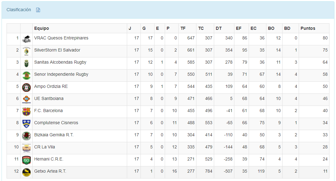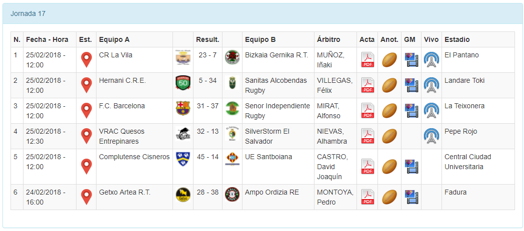 La situación de la clasificación comprendida entre los puestos 8º y 11º se estrecha de forma notable de cara al tramo final de temporada con la victoria de Cisneros y sobre todo con el triunfo clave de CR La Vila ante Bizkaia Gernika R.T. en El Pantano. Los locales fueron claramente superiores en los momentos decisivos del encuentro y a pesar de las tres amarillas recibidas en el último cuarto de hora, consiguieron resistir el buen final de Gernika. La pierna de Matías Jara y los ensayos de Tomás Suárez y Gonzalo Pérez sellaron 4 puntos importantísimos para los alicantinos tras la dura derrota cosechada ante Ordizia en la anterior jornada. Resultado final: CR La Vila 23 - Bizkaia Gernika R.T. 7.