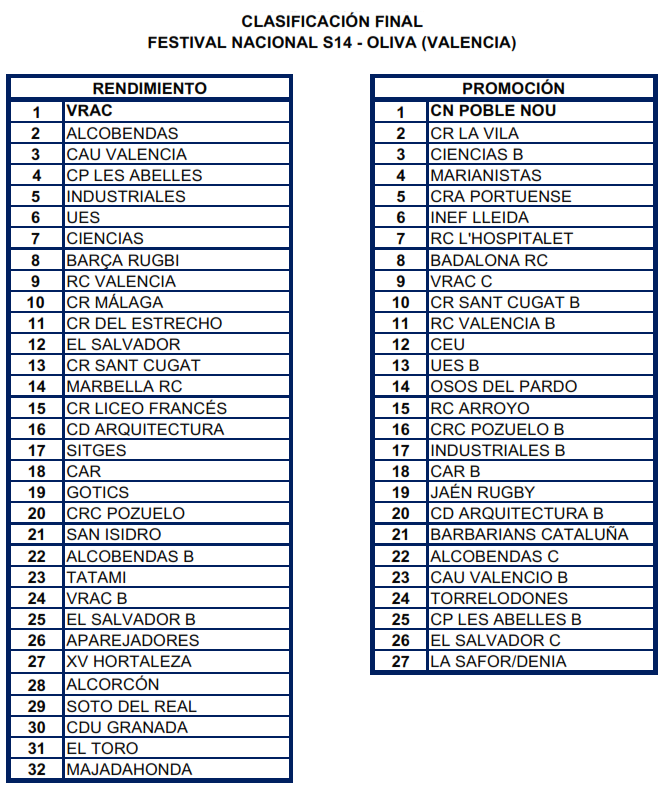 La edición 2019 del Festival Nacional S14, celebrada en las instalaciones deportivas de Oliva Nova (Oliva, Valencia), brilló con luz propia y sirvió para que los jugadores y jugadoras de hasta 59 equipos, cifra récord, sumasen una magnífica experiencia a su carrera de jóvenes rugbiers. El VRAC se alzó merecidamente con el título de campeones, tras vencer en la final al Alcobendas Rugby por un ajustado 7-10.