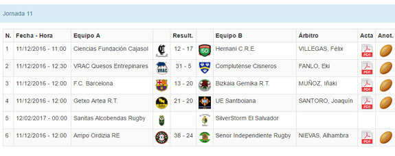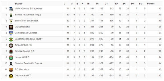 La jornada se abría en Sevilla con el encuentro que enfrentaba a los locales contra el Hernani, ambos luchando por afianzar la distancia con los últimos de la tabla. Aunque el Ciencias abría el marcador con un ensayo de su zaguero Luis Vázquez los guipuzcoanos supieron rehacerse en la segunda parte con dos ensayos transformados y un golpe de castigo que les otorgaban el 12-17 final y la merecida victoria. Los sevillanos caen hasta la décima posición y Hernani asciende a la novena empatados a puntos.