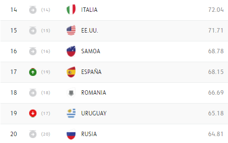 El XV del León ha visto recompensada su sobresaliente gira sudamericana con un ascenso muy a tener en cuenta en el Ranking de World Rugby, aupándose a la 17ª posición. Aunque ya sabíamos que el equipo que dirigen Santiago Santos y Miguel Velasco había conseguido los puntos necesarios para esta hazaña después de la prestigiosa victoria ante Uruguay (21-41), este lunes la federación mundial lo corroboró tras actualizar esta clasificación.