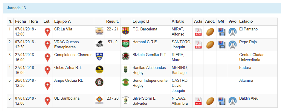 Abrirá la jornada el sábado a las 16:00 el duelo por la octava plaza entre Complutense Cisneros y Bizkaia Gernika, dos escuadras que llegan en momentos similares tras haber caído en los dos últimos duelos de Liga y que necesitan los puntos si no quieren que sus perseguidores de la parte baja de la tabla, muy cercanos en cuanto a puntos, les dejen en una posición de peligro. El conjunto vasco se llevó el partido de la ida por un ajustado 15-13, y de ganar otra vez empezarían las urgencias para los colegiales que sólo han conseguido cuatro victorias en lo que va de temporada.