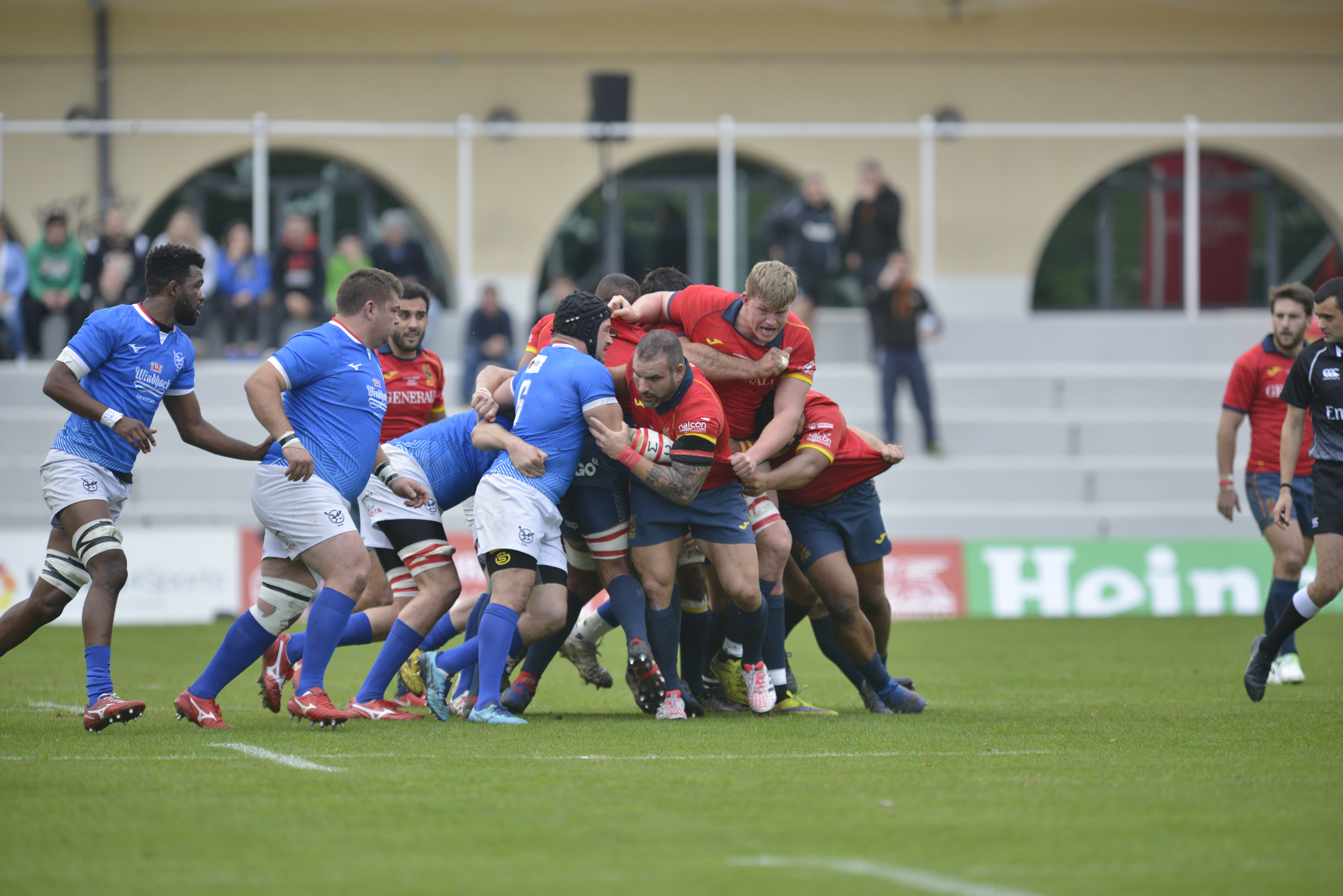 El inicio del encuentro pilló algo fríos a los hombres de Santiago Santos, que cedieron la primera posesión a pesar de recibir el oval del saque de centro inaugural. La Selección namibia impuso su físico y su dominio en los puntos de encuentro, y fruto de una de las primeras melés llegó el primer ensayo del encuentro de la mano de Damian Stevens, medió melé visitante que vió un hueco y lo atacó con decisión haciendo gala de su velocidad endiablada. Desde ese momento los españoles se pudieron las pilas, y comenzaron a construir basándose en la melé y en un poderosísimo maul que Namibia sufrió mucho para parar.