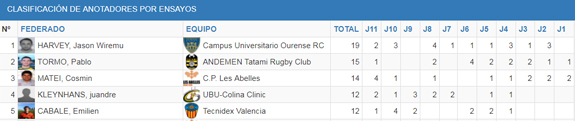 Curiosamente el MVP en cuanto a ensayos se refiere no es del equipo más anotador de la Liga, sino Jason Harvey del Campus Universitario Ourense con 19 ensayos en 10 partidos, ya que hubo uno que no pudo disputar. El apertura neozelandés ha mejorado notablemente sus números respecto al año pasado, ya que en las mismas fechas la pasada temporada se encontraba en la tercera posición con 9 marcas.