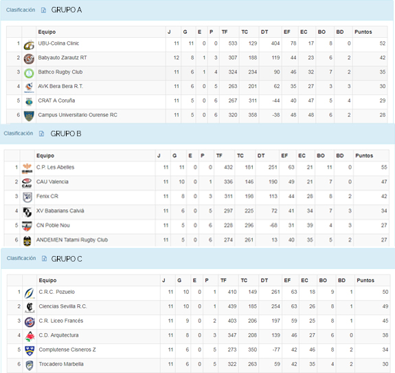 Sólo dos equipos no han conseguido ganar ningún partido en las últimas 11 jornadas, Inter RC, recién ascendido al Grupo B que además sólo ha conseguido un bonus defensivo alejándole del BUC Barcelona con tres partidos ganados, y URA, con dos bonus defensivos y uno ofensivo que cierra el Grupo C, precedido de Universidad de Granada y Sanitas Alcobbendas Rugby B con dos victorias cada uno.