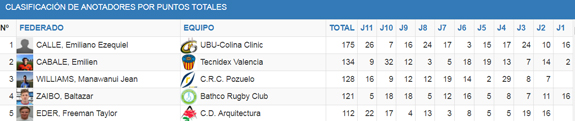 En cuanto al ranking de anotadores al pie y de puntos totales, Emiliano Calle del UBU-Colina Clinic lidera con 135 y 175 respectivamente. El apertura hispano argentino internacional con el XV del León llegó a Burgos para suplir la marcha de Shane Imo y se ha convertido en uno de los pilares del equipo.