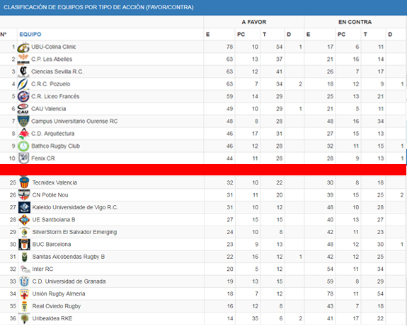 Mucha culpa de esto la tienen los equipos que se sitúan en cabeza de cada uno de los grupos y de ellos el que más ensayos ha conseguido anotad es el UBU-Colina Clinic con una media de siete por partido que además se postula como el equipo con la mejor defensa al haber recibido sólo 17 ensayos en 11 jornadas, seguido muy de cerca por CRC con 18. En la otra cara de la moneda Uribealdea RKE ha sido el equipo que menos ha pisado la línea de cal, sólo en 17 ocasiones; y el que según los números ha tenido una defensa menos efectiva es Unión Rugby Almería con 78 ensayos en contra.
