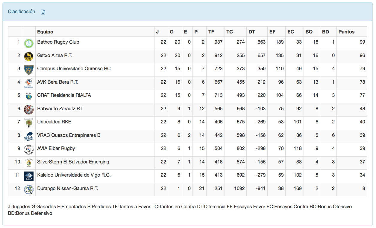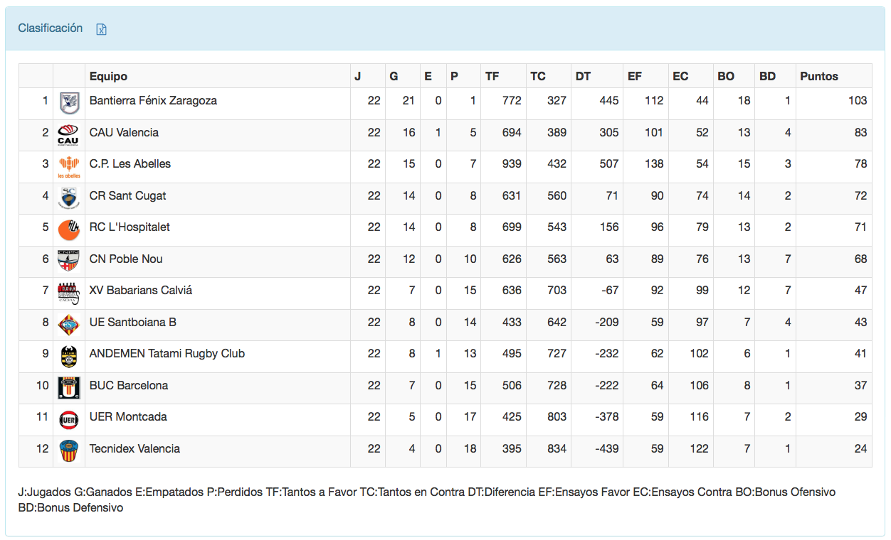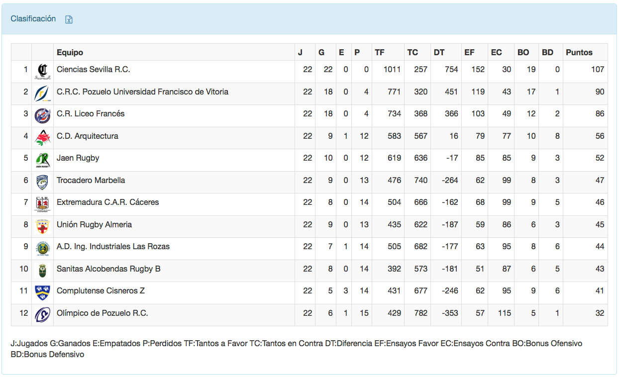 Por arriba destacan Ciencias Cajasol Sevilla con 107 puntos y pleno de victorias en la temporada, Bantierra Fénix Rugby Zaragoza con 103 puntos y una sola derrota y Bathco R.C. de Santander con 98 puntos y dos resbalones ante CRAT y Getxo. En la parte baja descienden Durango Nissan-Gaursa con sólo 8 puntos y una victoria en toda la temporada, Tecnidex Valencia con cuarto partidos ganados y 24 puntos y Olímpico de Pozuelo con 32 puntos y 6 victorias, curiosamente una más que Cisneros, penúltimo clasificado al que le salvaron los empates y puntos bonus.