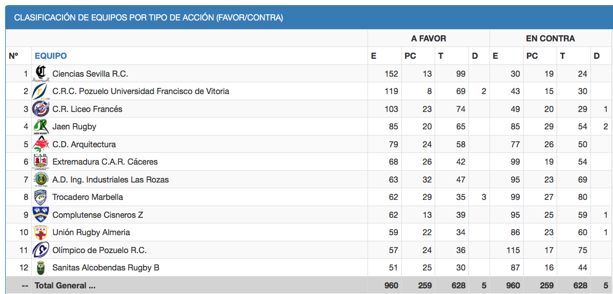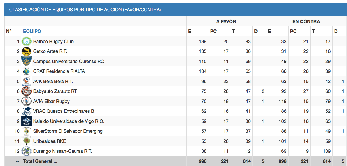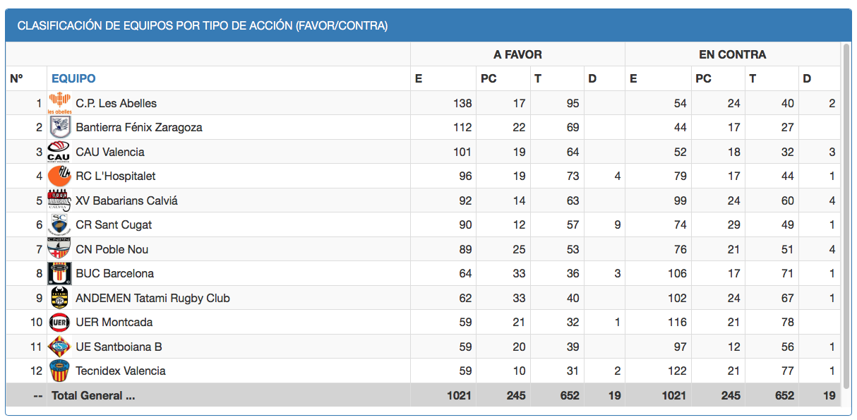 Por el contrario los equipos con menor acierto en ataque han sido Durango Nissan-Gaursa (38 ensayos), Sanitas Alcobendas B (51), Uribealdea (53), SilverStorm El Salvador Emerging (57) y los madrileños de Olímpico (57). Si nos fijamos en la defensa menos efectiva también lidera la estadística Durango Nissan-Gaursa (169 ensayos recibidos), seguido de Tecnidex Valencia (122), AVIA Eibar (118), UER Montcada (116), Olímpico de Pozuelo (115) y BUC Barcelona (106).