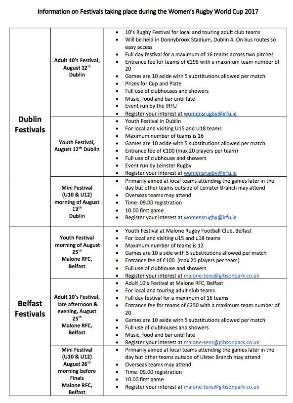 Del 9 al 26 de agosto se celebrará en Irlanda el Mundial de Rugby Femenino, WRWC 2017, y World Rugby y la Federación Española de Rugby en su nombre invita a todos los aficionados que se desplacen hasta la isla esmeralda a llevarse las botas y participar de lo que será una auténtica fiesta de nuestro deporte gracias a la organización de festivales de rugby para toda clase de equipos y para todas las edades. Acompaña a la Selección Femenina en el Mundial y disfruta también jugando.