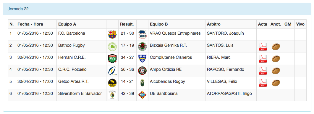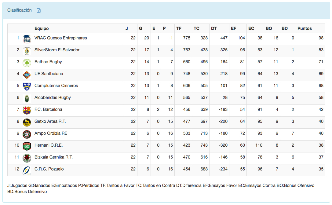 El FC Barcelona le plantó cara al vigente campeón de Liga, VRAC Quesos Entrepinares, que cierra la fase regular de Liga con unos registros envidiables, 20 victorias, un empate y una derrota y 104 ensayos a favor por tan sólo 38 en contra, más de 4 ensayos anotados por partido y menos de 2 recibidos de media. El otro equipo de Valladolid, el SilverStorm El Salvador, ganó en la última jugada a la UE Santboiana gracias a un drop de Sam Katz que acabó con las aspiraciones del decano del rugby español de quedar tercero.
