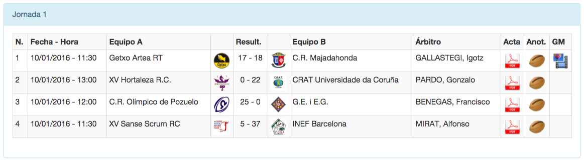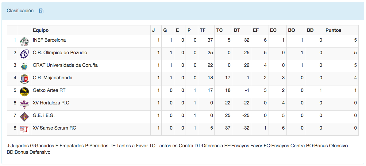 INEF Barcelona se ha convertido en el primer líder de la División de Honor Femenina 2015-2016 después de ganar a XV Sanse Scrum en el Teresa Boyal por 5-37, donde los seis ensayos conseguidos les han valido a las catalanas para adelantar en la diferencia de tantos, a los otros dos equipos que han logrado victoria con bonus. Segundas se han colocado las jugadoras del Olímpico de Pozuelo que han ganado 25-0 en el Valle de las Cañas al GEiEG, sumando 5 ensayos sin transformar y sin ceder ni un sólo punto. CRAT Universidade da Coruña tampoco ha cedido ninguno en su estreno frente a XV Hortaleza consiguiendo su primera victoria por 0-22, lo que las ha permitido ponerse terceras. Y CR Majadahonda se ha colocado en cuarta posición gracias a su victoria por la mínima, 17-18, frente a las finalistas del año pasado Getxo Artea en Fadura.