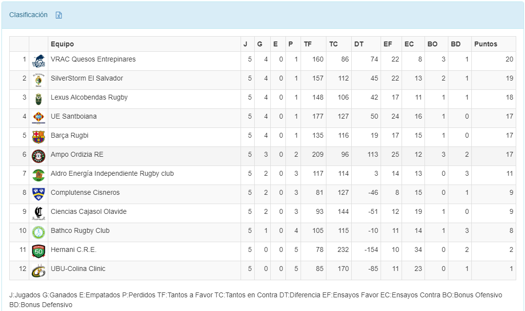 Cinco jornadas le han hecho falta al actual campeón de la División de Honor masculina, el VRAC Quesos Entrepinares, para situarse en lo alto de la clasificación tras su victoria clara en casa. Le siguen muy de cerca SilverStorm El Salvador y Lexus Alcobendas Rugby, que también sumaron el triunfo, aunque ambos tuvieron que remar mucho para lograrlo.