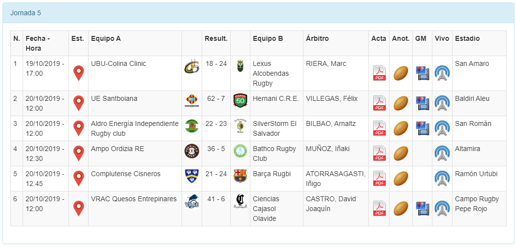 Sus vecinos vascos del Ordizia volvieron a la senda del triunfo ante Bathco Santander RC (36-5). Los de blanco y rojo desplegaron a la perfección sus muy variados recursos ofensivos para penetrar con regularidad la defensa de las Focas, quienes habían concedido muy pocos ensayos hasta el momento en el campeonato. Bathco tuvo jugadas puntuales brillantes en el juego abierto, pero cometieron demasiadas imprecisiones gracias parcialmente a la enorme presión de los locales. Ambos equipos pueden estar relativamente contentos con lo hecho hasta ahora, pero, cada uno en su lucha, saben que pueden optar a más.