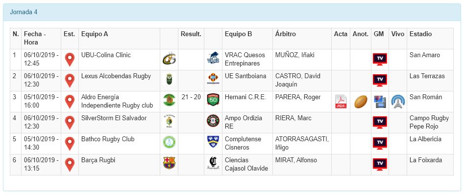 El encuentro entre Bathco y Complutense Cisneros, que también estaba previsto que se celebrase este sábado, se aplazó debido a que el campo de La Albericia no se encontraba en condiciones practicables y se jugará este domingo en San Román a las 12:00 horas.