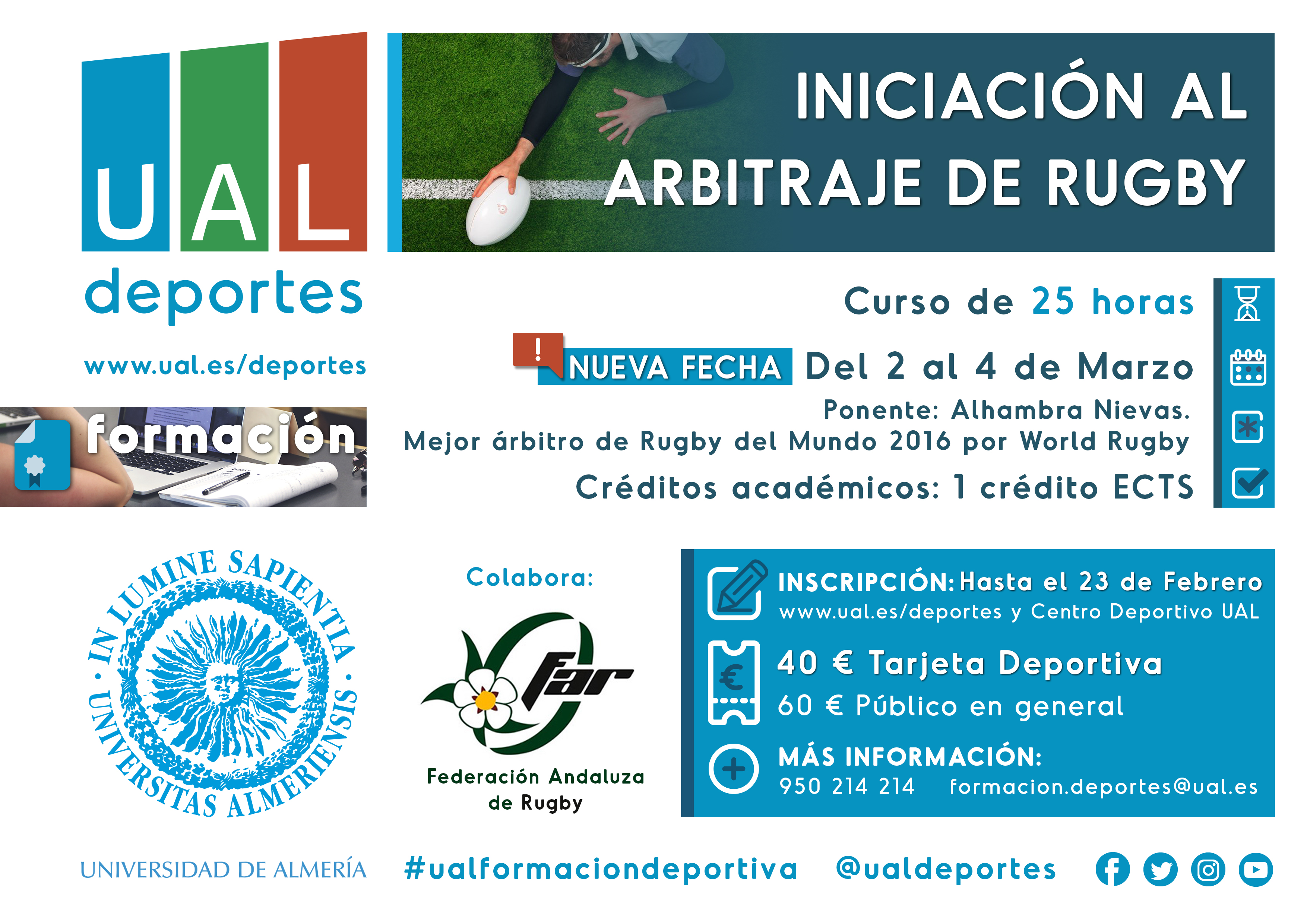 Aquí os dejamos el flyer con la información del curso de iniciación al arbitraje de rugby, promovido por UAL deportes y con la colaboración de Alhambra Nievas.