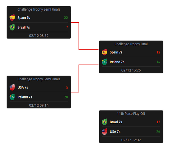 Tras la victoria, al otro lado les esperaba Irlanda que venía de ganar a la potente selección de EEUU por un implacable 28-5. El partido empezó de cara para las Leonas7s que abrieron el marcador con un ensayo transformado de Patricia García y otro de María Casado. Las jugadoras españolas se iban al descanso con un colchón de 12 puntos que parecía prometer una segunda parte cómoda y sin sobesaltos. Sin embargo las del Trébol subieron la velocidad tras el entretetiempo y consiguieron anotar dos ensayos con sendas transformaciones que les dió el Challenge Trophy. Una derrota 12-14 que deja una mala sensación general, aunque en el segundo día las Leonas hayan conseguido mejorar mucho su efectividad, compenetración y juego sobre el césped.