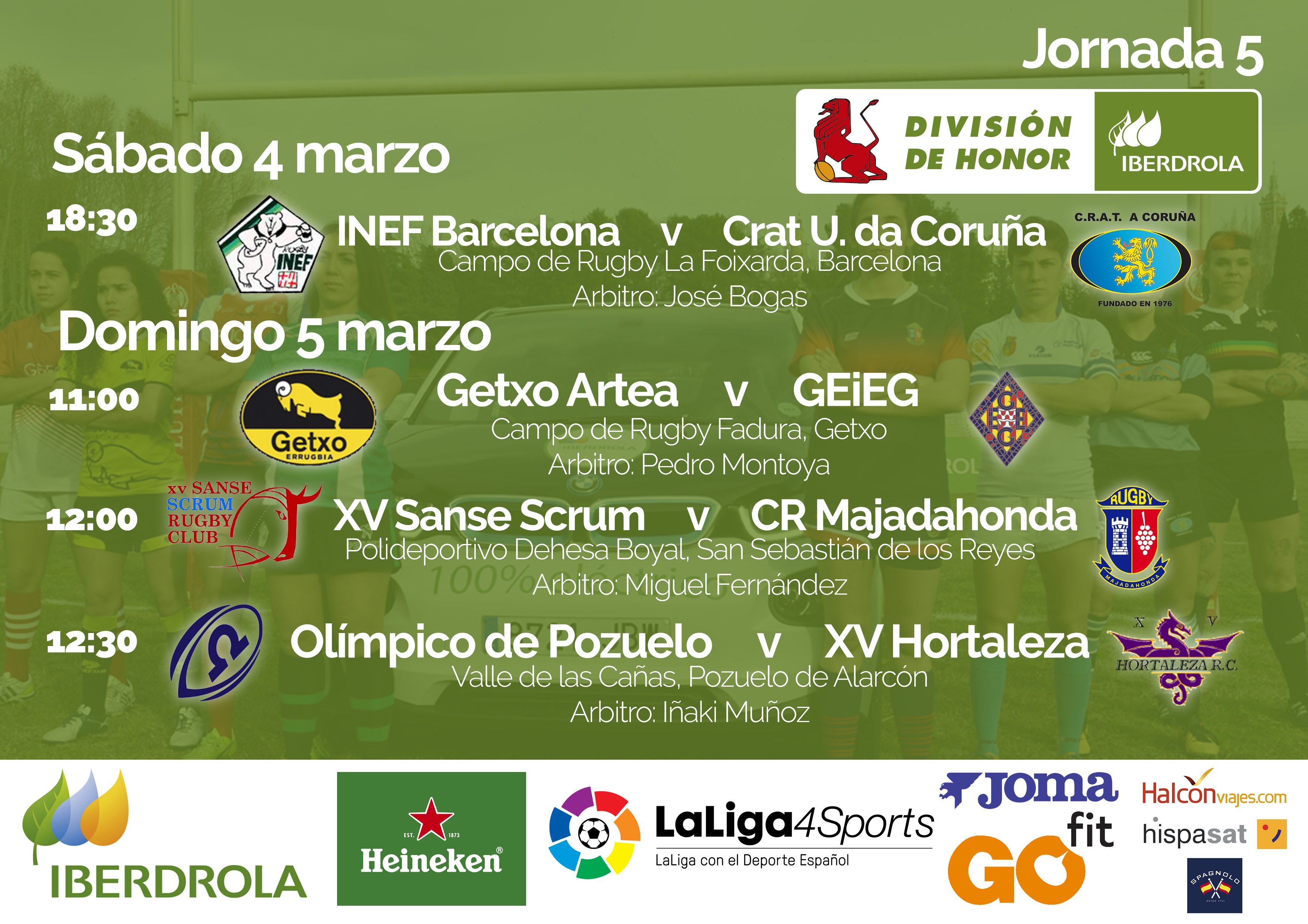 Para cerrar la jornada las líderes invictas de Olímpico de Pozuelo recibirán a las dragonas del XV de Hortaleza. Las cabecillas de la tabla parten con ventaja, ya que se han llevado los 4 partidos que han disputado con la máxima puntuación gracias a su buen ritmo de ensayos, pero las del Distrito de Hortaleza quieren quitarse la espina de la final de la Copa de Madrid que jugaron contra las olímpicas y perdieron 23-0, y abandonar ese sexto puesto de la clasificación que las obligaría por segundo año consecutivo a pelear por su plaza con el subcampeón de la DHFB.
