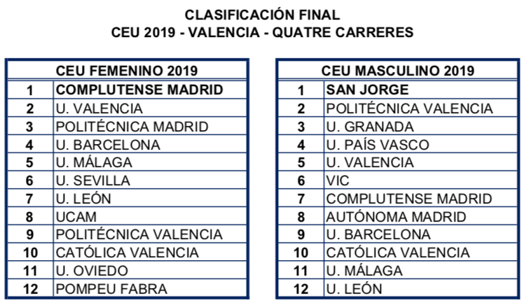 La Universidad San Jorge de Zaragoza y la Universidad Complutense de Madrid fueron los vencedores, en categoría masculina y femenina, respectivamente, del Campeonato de España Universitario que se ha disputado esta semana en Valencia. Organizado por la Universidad Católica, esta competición ha vuelto a reunir a lo mejor del deporte oval universitario de nuestro país.